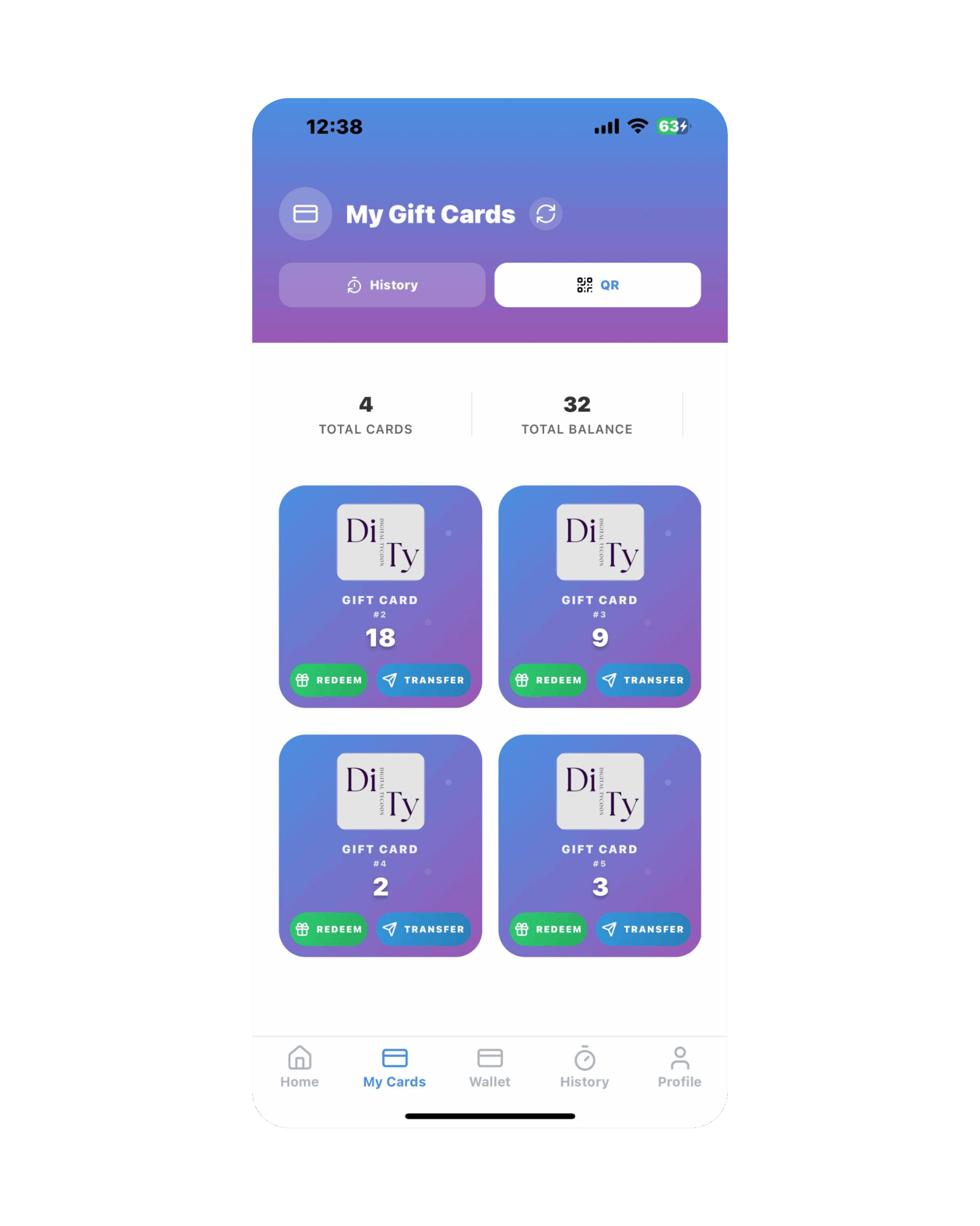 In DITY, redeeming your gift cards is quick and hassle-free, putting the power of your rewards right in your pocket. From the "My Gift Cards" tab in our app, you'll see all your active cards at a glance—complete with total count, overall balance, and individual values.