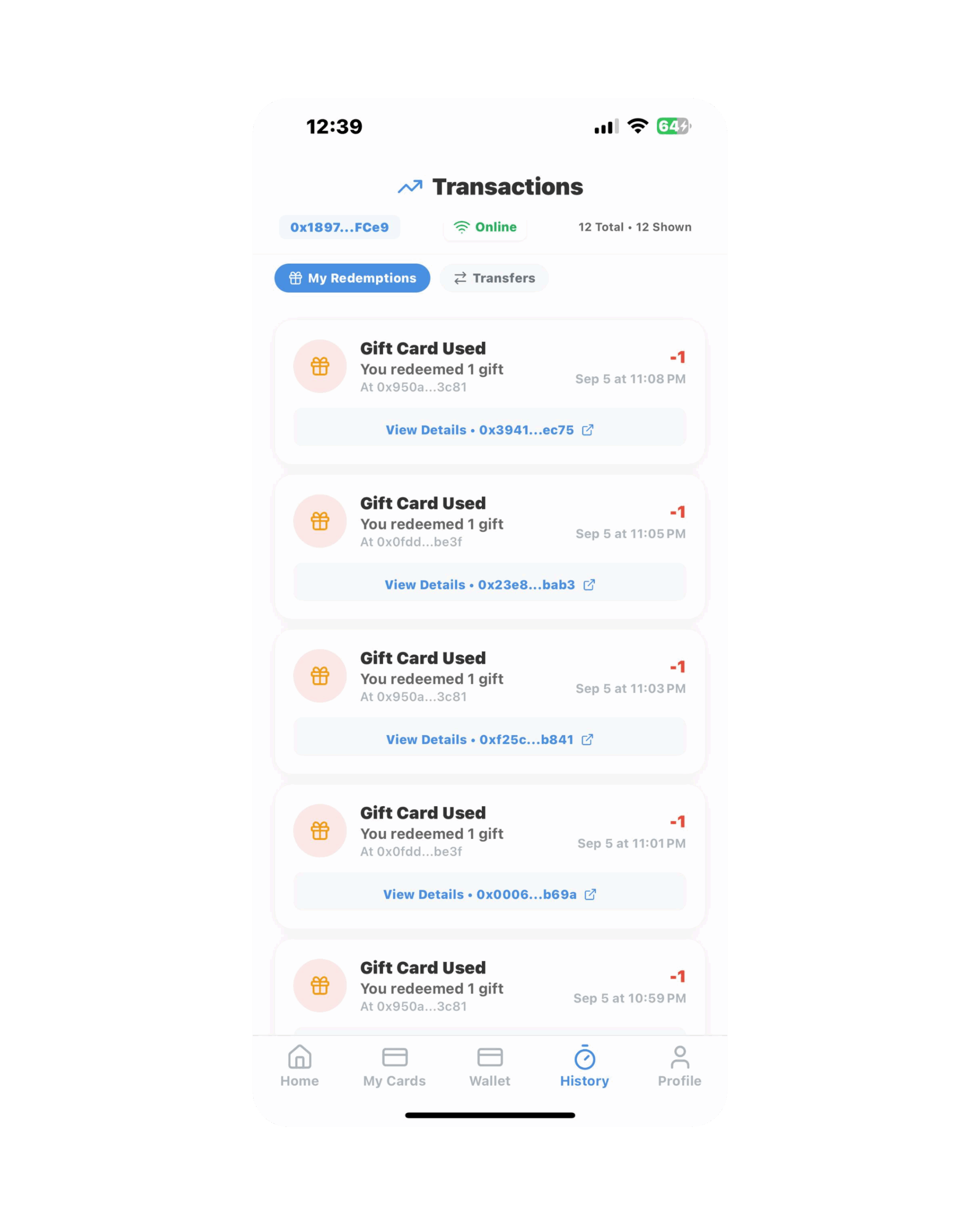 Stay on top of your gift card usage with DITY's clear redemption history. In the "Transactions" section of the app, switch to the "My Redemptions" tab to view a chronological list of all your past redemptions. Each entry shows key details like the amount redeemed (e.g., "You redeemed 1 gift"), the date and time (such as Sep 5 at 11:08 PM), and a unique blockchain address for verification.